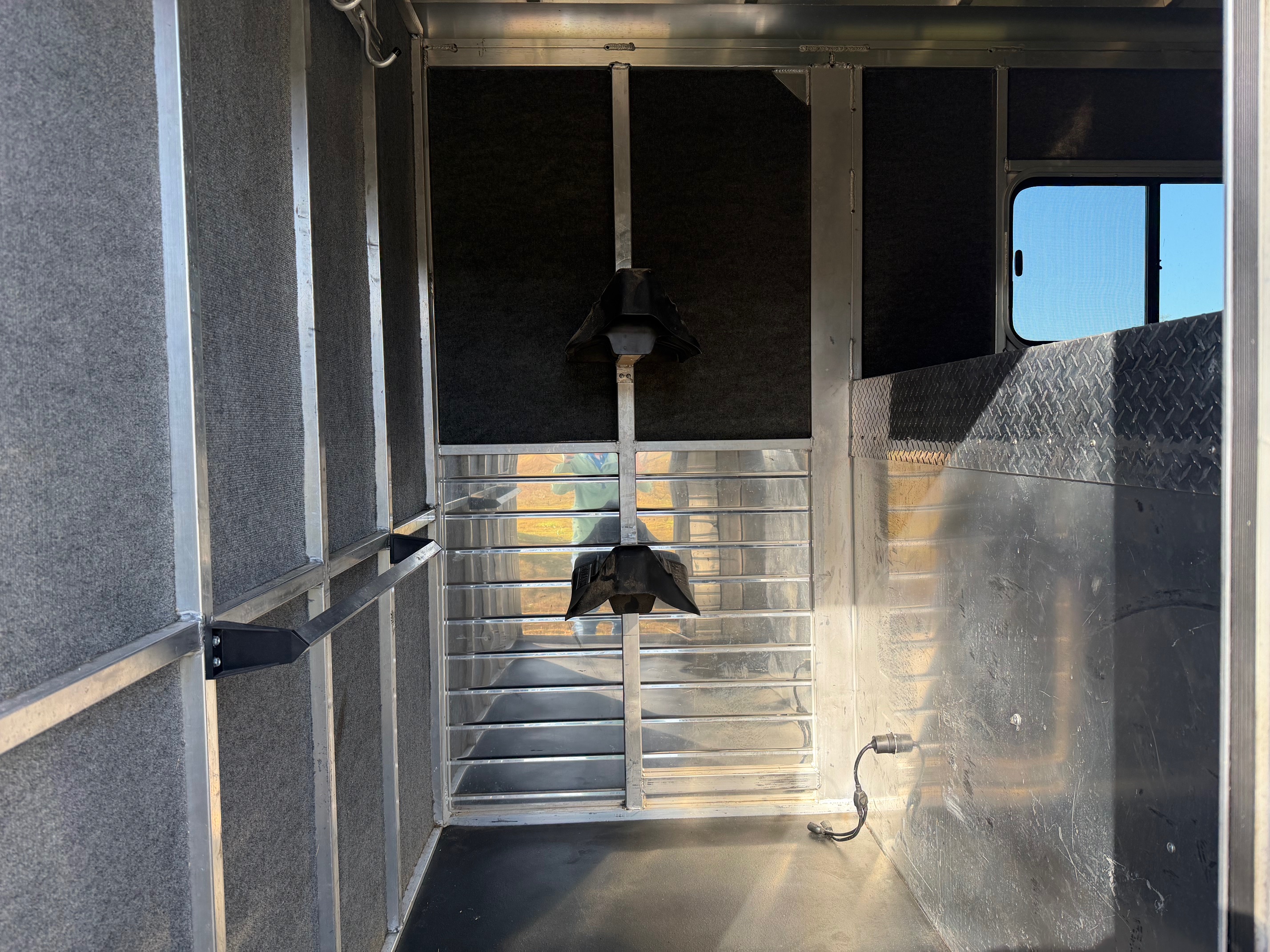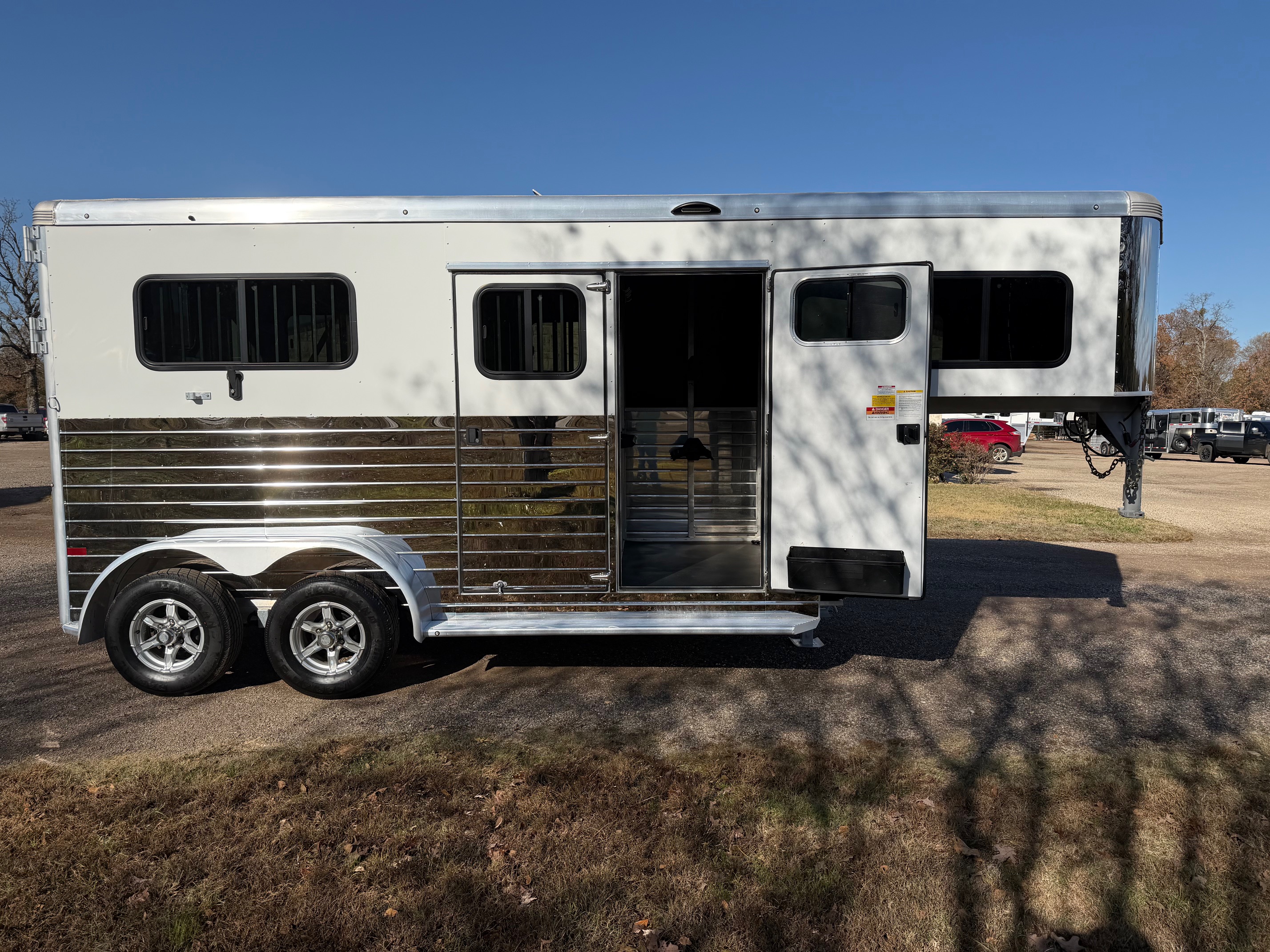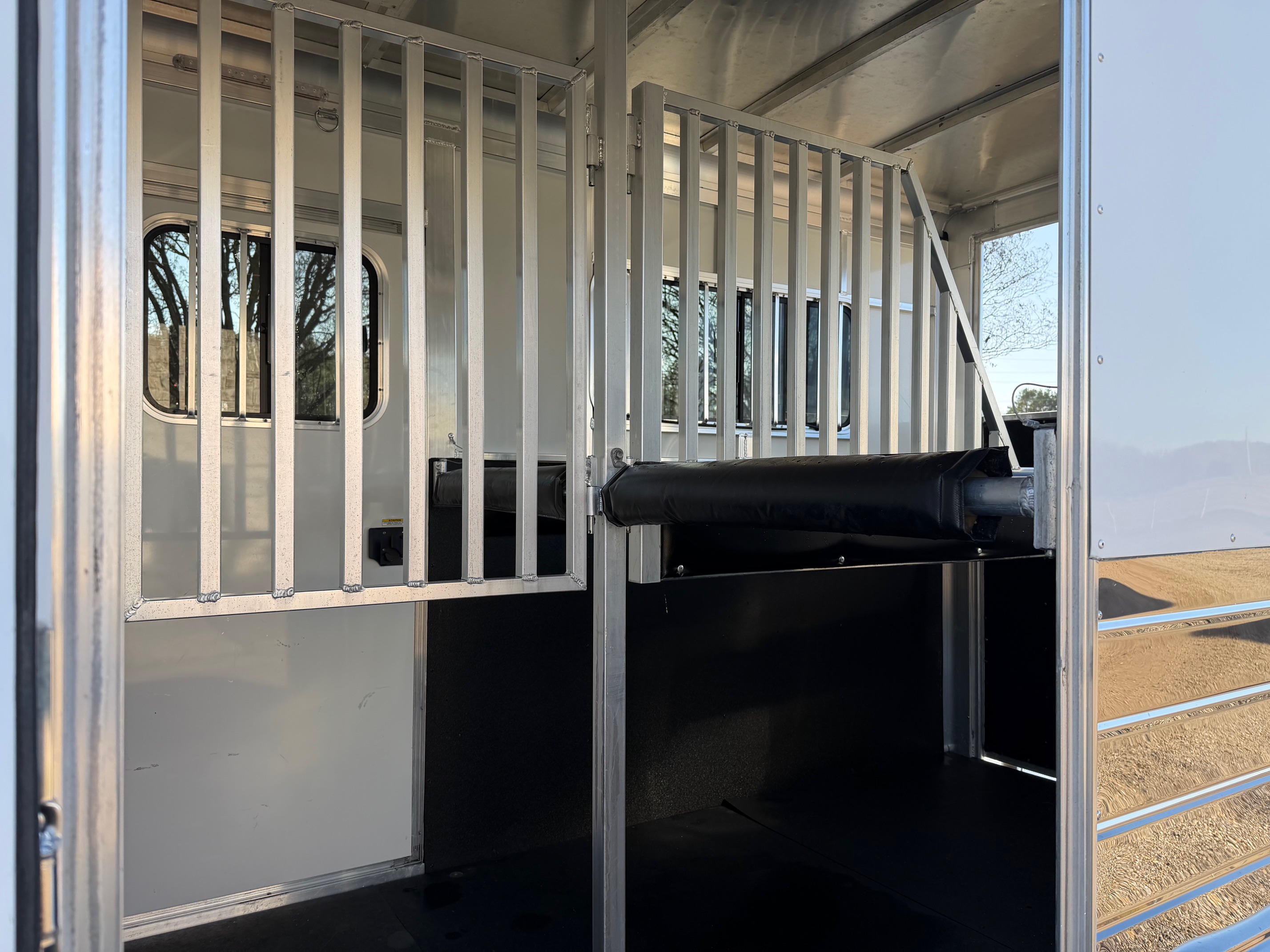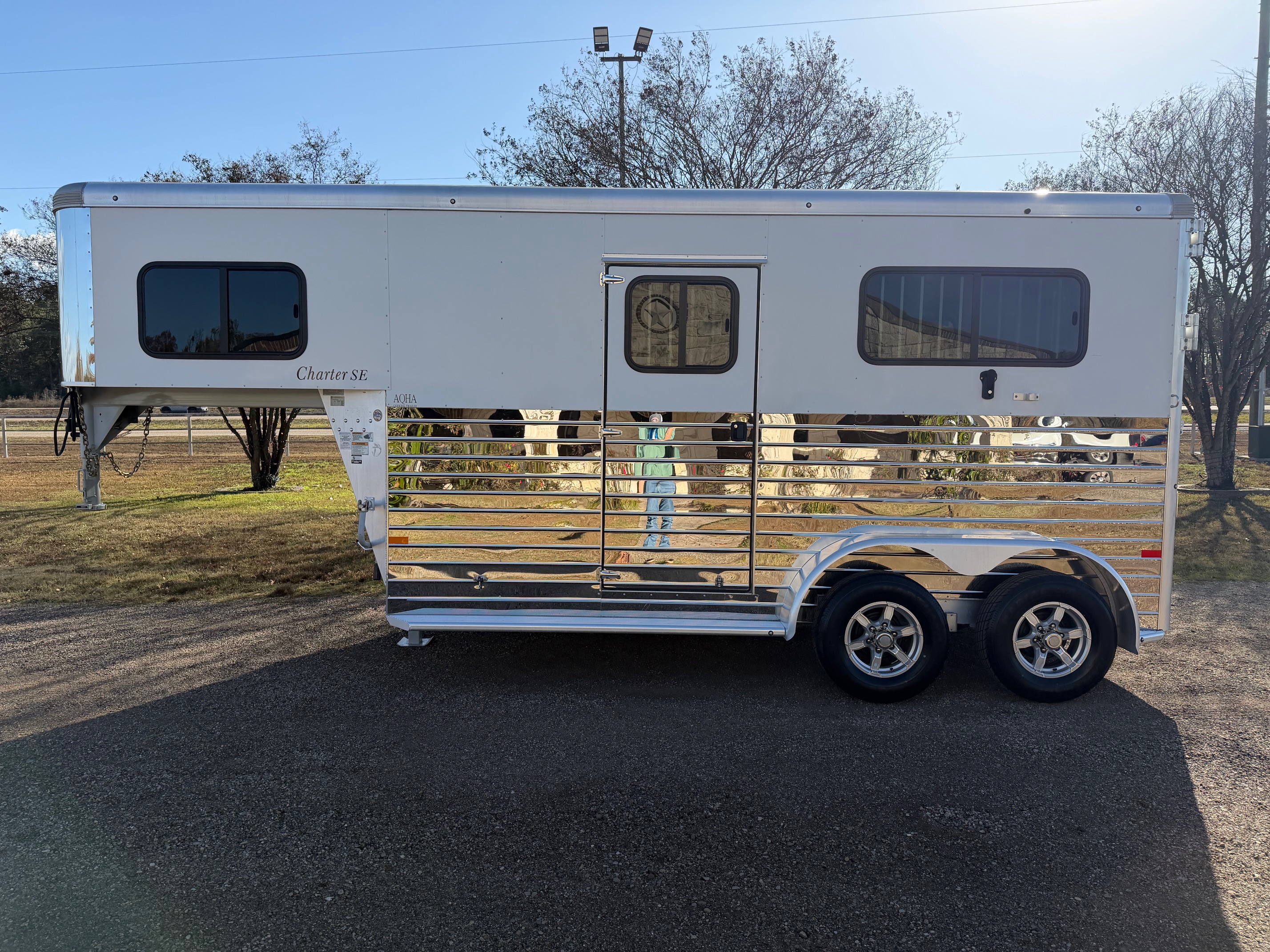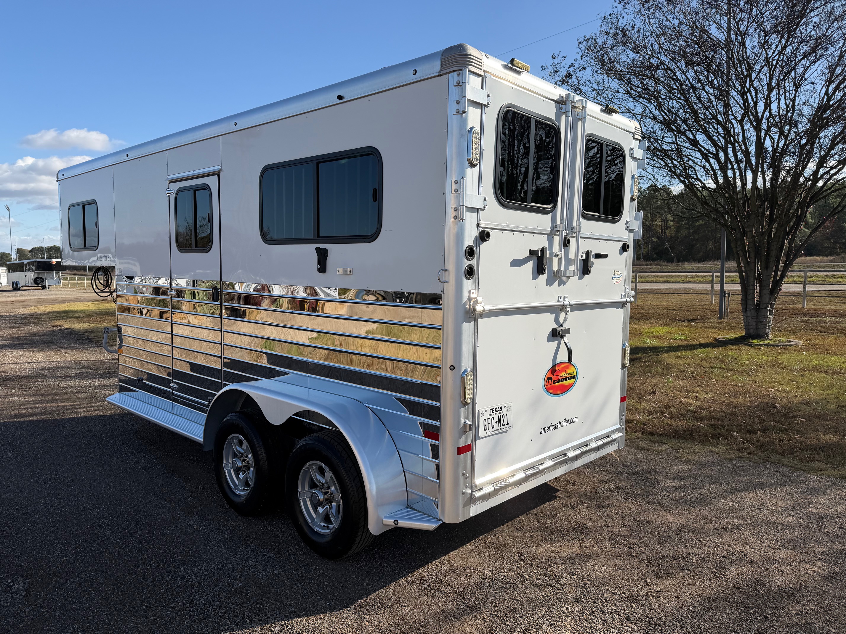 The Charter Gooseneck TR SE is a 2 horse straight load trailer with a large front tack room. It comes standard with two large sliding windows in the horse area, a divider between the stalls, a side access door per stall and are 7’ 6” tall. The Charter TR SE has two saddle racks in the tack room along with two large windows in the nose, a window in the tack door, and it also has windows in the rear tail curtains.